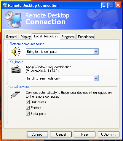 We use a program called mstsc to communicate with the remote servers to do interact with the member database and quicken. To move files between your personal computer and the remote server you will have to connect your drives when you connect your mstsc session.